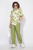 Жакет полуприлегающего силуэта с двухбортной застежкой на три обтяжные из атласной ткани пуговицы и одной потайной. Край борта овальной формы, что придаёт жакету утонченность. По переду обработаны фигурные рельефы из проймы, также имеется горизонтальный подрез,в котором расположены карманы. На правой центральной части полочки - три складки, параллельные подрезу. Дополнительно с левой стороны завязывается атласный бант,что придает нарядность и особый шарм. Одна часть банта крепиться на пуговицу, другая в боковом шве. Спинка со средним швом и вертикальными рельефами из проймы. Воротник пиджачного типа из атласной ткани с пикообразными лацканами. Рукава двухшовные, со шлицей в локтевом шве на одну пуговицу, также обтяжную из атласа. Жакет на подкладке. Брюки классические,со стрелками,с притачным поясом-сзади частично на резинке для удобства и комфортной посадки. На поясе имеются пять шлёвок. На передних половинках присутствуют карманы. Застёжка на молнию и пуговицу. Костюм выполнен из качественной костюмной ткани с отделкой из атласа.