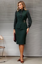 Блузка полуприлегающего силуэта. По переду нагрудные вытачки, спинка - с талиевыми вытачками. Воротник-стойка с рюшей по краю и завязкой. Рукав втачной, одношовный, по низу с манжетой. Жилет приталенного силуэта. Перед жилета отрезной по талии, с асимметричной фигурной баской. По верхней части переда по две талиевых вытачки. Спинка со средним швом и талиевыми вытачками. Застежка в виде пояса через пряжку-полукольца. Жилет на подкладке. Юбка зауженная к низу, с застежкой и шлицей в среднем шве. Юбка на притачном поясе, на подкладке. Элегантный комплект безупречно сидит на фигуре и смотрится очень современно, а регулируемый пояс поможет усилить акцент на талии