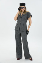 Костюм женский, состоящий из брюк и жилета. Жилет полуприлегающего силуэта с рельефами по переду и спинке, отрезной по линии талии. Низ жилета ассиметричной формы. На баске с одной стороны обработаны прорезные карманы в рамку, один из которых функциональный. Застежка двубортная на петли-пуговицы и декоративную пату. Жилет на подкладке. Брюки прямые, сверху на притачном поясе, сзади с резинкой. На передних половинках обработаны карманы. Застежка на тесьму-молнию. Данный комплект можно дополнить блузой, что позволит Вам создать разные образы.