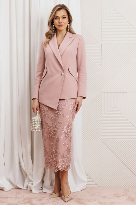 Перед вами нарядный костюм-двойка из новой весенней коллекции — идеальный выбор для деловой женщины, которая ценит строгую классику в сочетании с современным дизайном. Двухпредметный комплект состоит из жакета из костюмной ткани  и элегантной юбки из гипюра. Жакет свободного силуэта с воротником пиджачного типа, с двубортной застёжкой на пару пуговиц. Спереди обработаны карманы «в рамку», нагрудные вытачки, бочки фигурной формы, переходящие в клапаны. Низа полочек ассиметричной формы, визуально вытягивающие фигуру. Спинка со средним швом и вертикальными рельефами, идущими от проймы, в которых обработаны шлицы. Рукава двухшовные, со шлицами в локтевых швах на пуговицу. Изделие на подкладке. Удлиненная юбка из о гипюра. Молния и шлица в среднем шве. Юбка на обтачке по талии, на подкладке. Зауженный крой не сковывает шаг, а длина позволяет экспериментировать с верхом - от романтичных блуз до лаконичных кроп-топов. Костюм выполнен в пыльно-розовом и вишневом цетах. Контраст фактур делает образ выразительным, статусным и идеально подходит для торжественных мероприятий, деловых встреч, офиса с дресс-кодом или светских выходов.