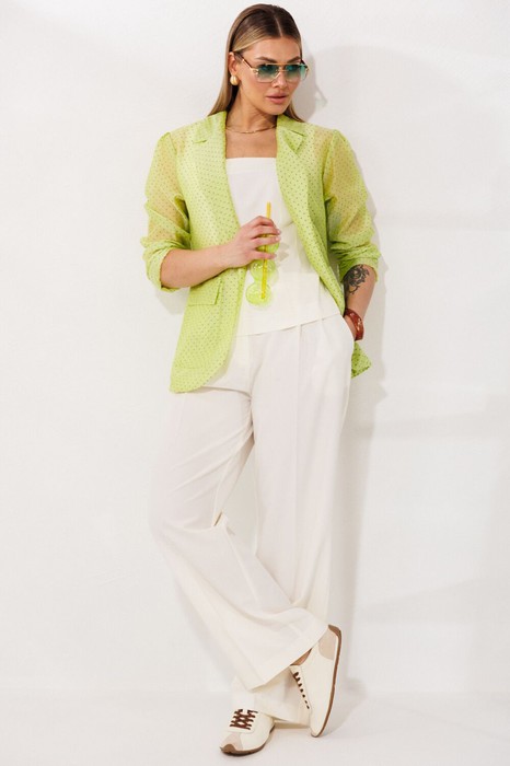 Комплект-тройка, состоящий из жакета, брюк и топа. Жакет выполнен из тонкой, прозрачной вуали свободного кроя без застежки по борту. Воротник английский, рукава по окату с небольшими складками, линия плеча слегка спущена. Рукав можно носить как длинным, так и с небольшим подворотом по низу. По переду накладные карманы и клапаны. По спинке средний шов и небольшие талиевые вытачки. По переду отрезной бочок. Топ из текстильной ткани, с укороченной линией плеча и расширенной горловиной. Горловина спинки и переда углубленные и квадратной формы. Спинка и перед с талиевыми вытачками для придания приталенного силуэта. По спинке застежка на потайную молнию. Брюки прямые, свободного кроя, со складками по передним половинкам. По бокам карманы "хулиганы". Пояс со шлевками и резинкой по задним половинкам брюк. Застежка по переду на молнию и пуговицу.