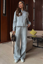 Костюм из трикотажного полотна «вельмонд двухсторонний » в комбинации двух видов: гладкокрашеного и с рисунком в узкую полоску в единой цветовой гамме, состоящий из джемпера и брюк. Джемпер – из гладкокрашеного полотна, с длинными втачными рукавами, горловиной овальной формы, обработанной втачной планкой из основного материала, разрезами в боковых швах и вышивкой на полочке. Брюки – длинные, прямые, с эластичной тесьмой по линии талии.