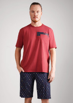 Костюм мужской, состоящий из футболки и брюк. Футболка однотонная с принтом на груди; модель свободная, со спущенной линией плеч, овальным вырезом горловины. Брюки из полотна с набивным рисунком эксклюзивного дизайна, прямые, с боковыми карманами с обтачными входами, на притачном поясе с отстроченной эластичной тесьмой.