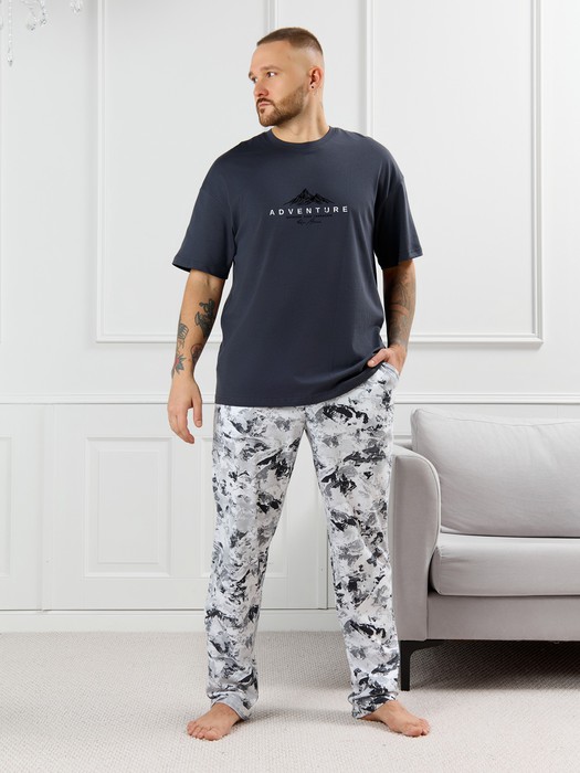 Костюм мужской, состоящий из футболки и брюк. Футболка однотонная с принтом на груди; модель свободная, со спущенной линией плеч, овальным вырезом горловины. Брюки из полотна с набивным рисунком эксклюзивного дизайна, прямые, с боковыми карманами с обтачными входами, на притачном поясе с отстроченной эластичной тесьмой.