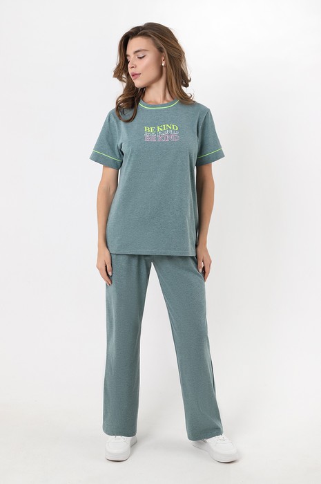 Костюм молодежный из гладкокрашенного трикотажного полотна «кулирка меланж» состоящий из футболки и брюк. Футболка – свободного покроя, с короткими втачными рукавами, горловиной овальной формы, обработанной двойной притачной бейкой из контрастного материала. На полочке и рукаве принт, выполненный в технике «шелкографии», рукава с отделочными манжетами и кантом.Брюки – свободные, с карманами в боковых швах, на притачном поясе с эластичной тесьмой внутри.
