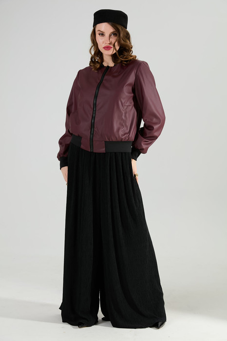 Костюм трехпредметный: состоит из джемпера, брюк и топа. Джемпер прямого силуэта на подкладке. Рукав втачной. По переду карманы, застёжка на тесьму-молнию. Воротник прилегающий. Длина рукава 60 см, длина изделия 56 см. Топ на тонких регулируемых бретелях. Брюки-юбка свободного кроя из трикотажного гофре, верхний срез представлен широкой резинкой.