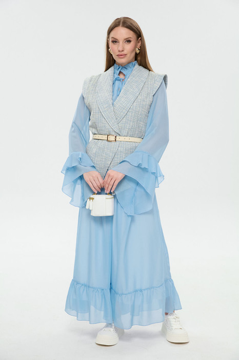 Костюм двухпредметный: состоит из платья и жилета. Платье макси свободного кроя с завышенной фигурной линией талии. Горловина оформлена воротником-стойкой с завязками, верхний край украшен рюшей. Рукав втачной широкий с асимметричными воланами по низу. Изделие на подкладке. Низ юбки оформлен воланом. Жилет удлиненный свободного прямого силуэта, воротник пиджачного типа. Линия низа по переду и спинке фигурная ассиметричная. Короткий рукав-крылышко. Талия фиксируется съемным ремнем из экокожи, для которого в боковых швах оформлены шлевки. Ремень идёт в комплекте к изделию.