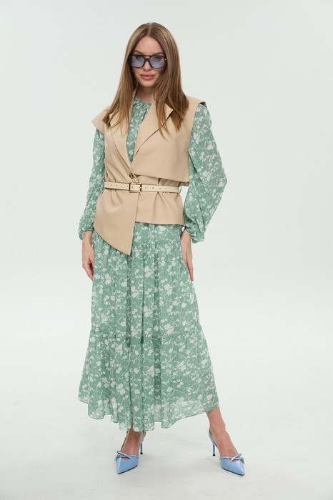 Костюм трёхпредметный: состоит из жилета, платья верхнего и нижнего. Платье состоит из двух платьев: верхнего и нижнего. Верхнее платье в пол свободного силуэта отрезное по линии бёдер. Перед лифа имеет расширение по низу. Горловина лифа собрана на сборку, оформлена вырезом по среднему шву и окантована бейкой, переходящей в завязки. Перед лифа цельный, имеет расширение по низу. Юбка платья имеет два яруса, которые собраны на сборку. Рукав объемный, одношовный. Низ рукава собран на сборку. Нижнее платье-комбинация на регулируемых бретелях. Жилет прямого силуэта с воротником пиджачного типа. По правой пройме переда расположена фигурная деталь "крылышко". Спинка со средним швом. По низу правого переда и низу правой спинки фигурная деталь. По левой части переда и левой части спинки отлетная кокетка. Изделие идёт в комплекте с ремнем из экокожи.