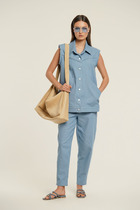 Трикотажный костюм двухпредметный: состоит из джемпера и юбки. Джемпер комбинированный свободного кроя со спущенной линией плеча. Горловина обработана воротником-стойкой с запахом. Рукава со вставкой из текстурного трикотажа "косичка". По низу рукава и изделия есть манжета. По переду изделие декорировано фигурными фалдами из основной ткани. Длина изделия 71 см. Длина рукава 58 см. Юбка-карандаш на резинке по линии талии. По боковым швам изделие декорировано трикотажной "косичкой".