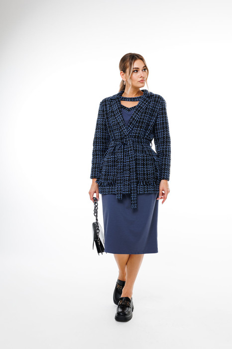 Элегантный костюм двухпредметный: состоит из кардигана и платья. Уютный кардиган свободного прямого силуэта длиной ниже линии бедер из приятной твидовой ткани в стиле "шанель". Изделие со съемным поясом на подкладке и накладными карманами с бахромой. Рукав втачной, двухшовный, пройма спущена на 3 см. Воротник английский. Застежка не предусмотрена. Трикотажное платье полуприлегающего силуэта с фигурным вырезом. Верхняя часть переда лифа (горловина) обработана обтачкой, в средней части лифа переда — фигурный вырез V-образной формы. Рукав фасона полуреглан. Длина изделия — миди. Изделие без подкладки.