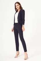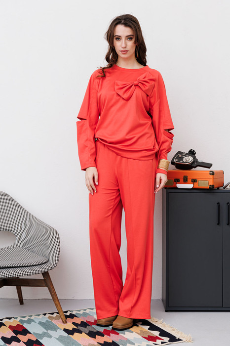 Костюм двухпредметный: состоит из джемпера и брюк. Джемпер свободного силуэта с округлой горловиной. Рукав комбинированного кроя, с передними и задними швами. Верхняя и нижняя часть рукава образуют между собой разрез. Карманы в боковых швах. По переду изделие декорировано фигурным бантом. Брюки со стрелкой свободного кроя, верхний срез представлен широкой резинкой, с карманами.