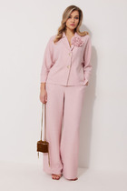 Костюм двухпредметный: состоит из джемпера и брюк. Джемпер свободного силуэта с округлой горловиной. Рукав комбинированного кроя, с передними и задними швами. Верхняя и нижняя часть рукава образуют между собой разрез. Карманы в боковых швах. По переду изделие декорировано фигурным бантом. Брюки со стрелкой свободного кроя, верхний срез представлен широкой резинкой, с карманами.