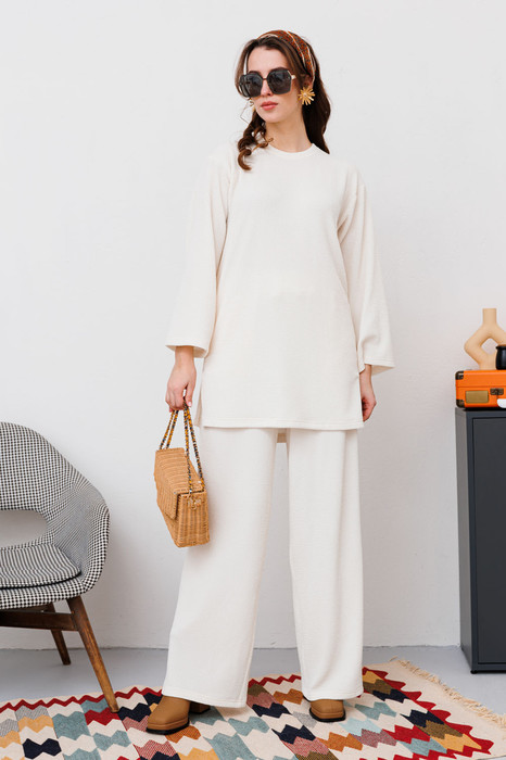 Костюм двухпредметный: состоит из блузы и брюк. Блуза свободного кроя. Рукав втачной, планка по горловине. Вырез круглый. Элегантные брюки свободного кроя, верхний срез собран на резинку. От бёдер максимально расклешенные.