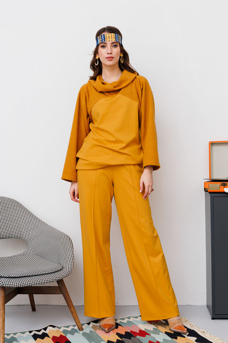 Костюм двухпредметный: состоит из джемпера и брюк. Джемпер из комбинированной ткани свободного силуэта. Рукав реглан. Воротник стойка. Брюки со стрелкой свободного кроя, верхний срез представлен широкой резинкой, с карманами.