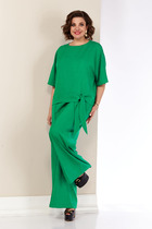 Костюм двухпредметный: состоит из рубашки - кропа и юбки. Укороченная рубашка из денима. Модель свободного кроя собрана на резинку по нижнему краю. Отложной воротник. Изделие застегивается на кнопки. Юбка - солнце длиной миди из облегчённого денима с узким поясом. В боковых швах расположены карманы. Застежка на кнопки с цельнокроеной планкой. Длина около 94 см. Изделие без подкладки.