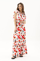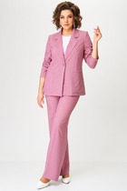 Костюм двухпредметный: состоит из блузы и юбки. Блуза прямого силуэта свободного кроя с втачным рукавом со спущенной проймой. По горловине переда планка с запахом. Воротник с цельнокроенной стойкой. По низу переда имеется нашивка из экокожи. Боковые швы с разрезами. Юбка длиной миди прямая на резинке. Разрез по переду. Изделие без подкладки.