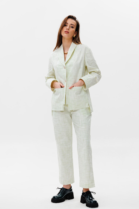 Костюм двухпредметный, состоит из брюк и жакета.  Жакет свободного прямого силуэта со слегка заниженной линией плеча. Однобортная застёжка на петли и пуговицы. По переду два больших накладных кармана. Воротник  шалевый цельнокроенный. Спинка с центральным швом. Изделие без подкладки. Брюки средней посадки, свободные вверху, слегка зауженные к низу с наклонными боковыми карманами.  Низ брючины ассиметричный. Пояс широкий отрезной, сзади на эластичной тесьме-резинке, по переду застежка на петли-пуговицы.