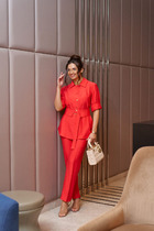 Костюм двухпредметный: состоит из рубашки и брюк. Рубашка прямого кроя объёма оверсайз со спущенной линией плеча с асимметричным бочком. Горловина обработана рубашечным воротником с отрезной стойкой. Застёжка центральная на петли и пуговицы. Есть нагрудный карман. Низ рукава обработан притачной манжетой, застёгивается на пуговицы. Брюки средней посадки, свободные вверху, слегка зауженные к низу с наклонными боковыми карманами. Низ брючины ассиметричный, декорирован пуговицами. Пояс широкий отрезной, сзади на эластичной тесьме-резинке, по переду застежка на петли-пуговицы.
