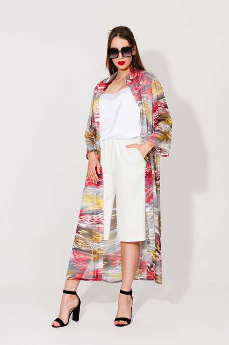 Костюм трехпредметный: состоит из топа, кардигана и шорт.Кардиган прямого кроя с акцентным принтом. Горловина обработана рубашечным воротником с отрезной стойкой. Модель со слегка приспущенной линией плеча и рукавами длиной 7/8. Застёжка центральная на петли и пуговицы. По низу изделия разрезы. Топ на регулируемых бретелях с полукруглым вырезом. Удлиненные шорты прямого кроя, верхний срез представлен широкой резинкой, с карманами.