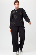 Костюм двухпредметный: состоит из жилета и брюк. Жилет назапах с полукруглым вырезом. Застёжка на петли и пуговицы на уровне плечевого шва. легантные брюки прямого кроя с боковыми карманами с отрезным бочком. Застежка на молнию и пуговицу. По переду - складки. Задние половинки с талиевыми вытачками и прорезными карманами с листочкой. Верхний срез обработан притачным поясом, по спинке на резинке.