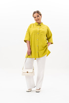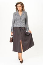 Костюм двухпредметный: состоит из жакета и брюк. Жакет рубашечного типа прямого силуэта с асимметричным низом. Рукав втачной со спущенной линией плеча, фиксируется на пату. Застежка центральная на петли и пуговицы, смещённая по косой. На левой полочке накладной карман с клапаном. Воротник отложной на стойке до половины спинки. Брюки свободного кроя из гладкой ткани сочетают элегантность и комфорт. Широкая резинка на поясе и наличие функциональных карманов подчеркивают удобство модели.