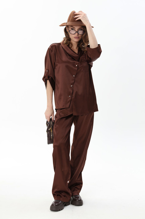 Костюм двухпредметный: состоит из жакета и брюк. Жакет рубашечного типа прямого силуэта с асимметричным низом. Рукав втачной со спущенной линией плеча, фиксируется на пату. Застежка центральная на петли и пуговицы, смещённая по косой. На левой полочке накладной карман с клапаном. Воротник отложной на стойке до половины спинки. Брюки свободного кроя из гладкой ткани сочетают элегантность и комфорт. Широкая резинка на поясе и наличие функциональных карманов подчеркивают удобство модели.