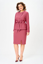 Костюм двухпредметный: состоит из брюк и жакета. Жакет свободного прямого силуэта со слегка заниженной линией плеча. Однобортная застёжка на петли и пуговицы. По переду два больших накладных кармана, на левом кармане нашивка. Воротник шалевый цельнокроенный. Спинка с центральным швом. Изделие на подкладке. Брюки средней посадки на резинке, слегка зауженные к низу с наклонными боковыми карманами. Низ брючины ассиметричный по переду