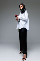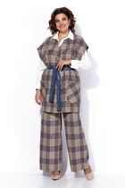 Костюм двухпредметный: состоит из джемпера и юбки. Джемпер-кейп прямого свободного силуэта. Горловина с цельнокроеным воротником-стойкой. Рукав втачной широкий, от линии локтя до запястья есть дополнительное отверстие для рук. Декорирован цветком из контрастной ткани. Юбка - солнце с узким поясом. В боковых швах расположены карманы. Застёжка на петлю и пуговицу и молнию по спинке.