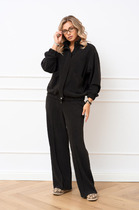 Костюм двухпредметный: состоит из джемпера и юбки. Джемпер-кейп прямого свободного силуэта. Горловина с цельнокроеным воротником-стойкой. Рукав втачной широкий, от линии локтя до запястья есть дополнительное отверстие для рук. Декорирован цветком из контрастной ткани. Юбка - солнце с узким поясом. В боковых швах расположены карманы. Застёжка на петлю и пуговицу и молнию по спинке.