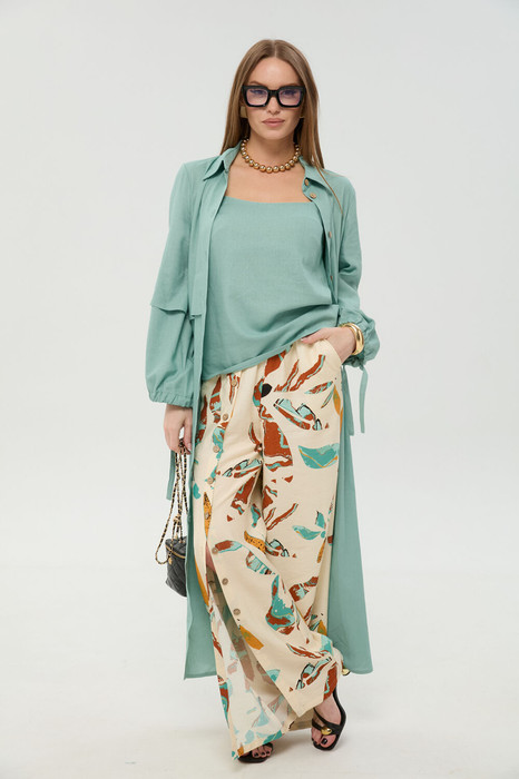 Костюм трехпредметный: состоит из кардигана-платья, брюк и топа. Платье-кардиган макси с центральной отрезной застёжкой на потайную планку на петли и пуговицы. По переду и спинке цельнокроеные складки на уровне талии. Рукав втачной, одношовный рубашечного типа. По низу рукава пробиты петли и вставлена завязка для фиксации сборки . Воротник рубашечный стояче отложной. В комплект к изделию идёт пояс из основной ткани для максимально комфортного регулирования объёма. Брюки свободного кроя, верхний срез представлен широкой резинкой, с карманами. По центру правой брючины расположена планка с функционирующими петлями и пуговицами. Топ на тонких регулируемых бретелях.