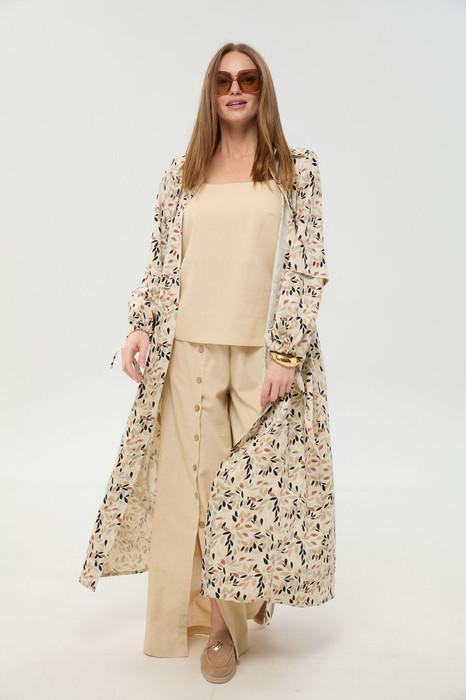 Костюм трехпредметный: состоит из кардигана-платья, брюк и топа. Платье-кардиган макси с центральной отрезной застёжкой на потайную планку на петли и пуговицы. По переду и спинке цельнокроеные складки на уровне талии. Рукав втачной, одношовный рубашечного типа. По низу рукава пробиты петли и вставлена завязка для фиксации сборки . Воротник рубашечный стояче отложной. В комплект к изделию идёт пояс из основной ткани для максимально комфортного регулирования объёма. Брюки свободного кроя, верхний срез представлен широкой резинкой, с карманами. По центру правой брючины расположена планка с функционирующими петлями и пуговицами. Топ на тонких регулируемых бретелях.