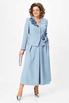 Костюм трехпредметный: состоит из кардигана-платья, брюк и топа. Платье-кардиган макси с центральной отрезной застёжкой на потайную планку на петли и пуговицы. По переду и спинке цельнокроеные складки на уровне талии. Рукав втачной, одношовный рубашечного типа. По низу рукава пробиты петли и вставлена завязка для фиксации сборки . Воротник рубашечный стояче отложной. В комплект к изделию идёт пояс из основной ткани для максимально комфортного регулирования объёма. Брюки свободного кроя, верхний срез представлен широкой резинкой, с карманами. По центру правой брючины расположена планка с функционирующими петлями и пуговицами. Топ на тонких регулируемых бретелях.