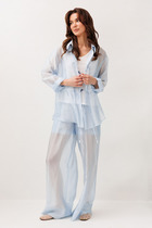 Костюм двухпредметный: состоит из жакета и брюк. Жакет прямого силуэта, воротник пиджачного типа, рукав одношовный, втачной с незначительно спущенной линией плеча, длиной три четверти, с патой. По линии ткани настрачная кулиса с завязками из основной ткани. Застежка центрально-бортовая. Линия низа верхней части фигурная ассиметричная. Брюки свободного кроя, верхний срез представлен широкой резинкой, с карманами. По центру правой брючины расположена планка с функционирующими петлями и пуговицами.