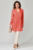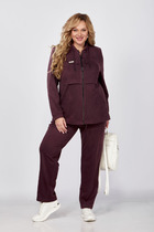 Комплект женский, состоящий из жакета и платья. Укороченный жакет полуприлегающего силуэта на подкладке. Деталь переда с двумя талевыми вытачками и с фигурным подрезом около горловины. Спинка со средним швом и рельефами, выходящими из проймы вниз. Рукава втачные, двухшовные, длиной 48,0 см., с разрезом по локтевому шву. Горловина углубленная, круглая, обтачная. Борта круглые, застежка на навесную петлю-пуговицу. Изделие с плечевыми накладками. Платье полуприлегающего силуэта, отрезное по линии талии. На детали переда рельефы выходят из проймы, проходят через центр груди вниз. Спинка цельнокроеная, с талевыми выточками. Юбка широкая к низу, с тремя клиньями спереди и сзади. Посередине каждого клина зашиты встречные складки. В левом боковом шве обработана застежка на потайную тесьму молнию. Рукава втачные, одношовные. Горловина углубленная, обтачная, с вырезом в виде “капельки” посредине переда. Углы выреза скреплены украшением. Пояс отлетной, обтачной, из двух цветов ткани, с перекантом на лицо и с застежкой на петлю-пуговицу сзади. Изделие с плечевыми накладками.