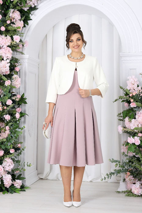 Комплект женский, состоящий из жакета и платья. Укороченный жакет полуприлегающего силуэта на подкладке. Деталь переда с двумя талевыми вытачками и с фигурным подрезом около горловины. Спинка со средним швом и рельефами, выходящими из проймы вниз. Рукава втачные, двухшовные, длиной 48,0 см., с разрезом по локтевому шву. Горловина углубленная, круглая, обтачная. Борта круглые, застежка на навесную петлю-пуговицу. Изделие с плечевыми накладками. Платье полуприлегающего силуэта, отрезное по линии талии. На детали переда рельефы выходят из проймы, проходят через центр груди вниз. Спинка цельнокроеная, с талевыми выточками. Юбка широкая к низу, с тремя клиньями спереди и сзади. Посередине каждого клина зашиты встречные складки. В левом боковом шве обработана застежка на потайную тесьму молнию. Рукава втачные, одношовные. Горловина углубленная, обтачная, с вырезом в виде “капельки” посредине переда. Углы выреза скреплены украшением. Пояс отлетной, обтачной, из двух цветов ткани, с перекантом на лицо и с застежкой на петлю-пуговицу сзади. Изделие с плечевыми накладками.