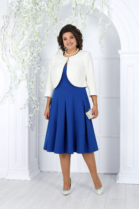 Комплект женский, состоящий из жакета и платья. Укороченный жакет полуприлегающего силуэта на подкладке. Деталь переда с двумя талевыми вытачками и с фигурным подрезом около горловины. Спинка со средним швом и рельефами, выходящими из проймы вниз. Рукава втачные, двухшовные, длиной 48,0 см., с разрезом по локтевому шву. Горловина углубленная, круглая, обтачная. Борта круглые, застежка на навесную петлю-пуговицу. Изделие с плечевыми накладками. Платье полуприлегающего силуэта, отрезное по линии талии. На детали переда рельефы выходят из проймы, проходят через центр груди вниз. Спинка цельнокроеная, с талевыми выточками. Юбка широкая к низу, с тремя клиньями спереди и сзади. Посередине каждого клина зашиты встречные складки. В левом боковом шве обработана застежка на потайную тесьму молнию. Рукава втачные, одношовные. Горловина углубленная, обтачная, с вырезом в виде “капельки” посредине переда. Углы выреза скреплены украшением. Пояс отлетной, обтачной, из двух цветов ткани, с перекантом на лицо и с застежкой на петлю-пуговицу сзади. Изделие с плечевыми накладками.
