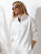 Блузка полуприлегающего силуэта, выполнена из основной ткани. Модель без подкладки, рукавов и плечевых накладок. На переде обработаны 4 подреза: один направлен по диагонали от левой проймы до низа, три остальных, декорированных стразами, подреза начинаются в области правого плеча, расходятся «лучами» и входят в шов первого подреза. Спинка с талиевыми вытачками и средним швом, в верхней части которого расположена застежка на потайную тесьму-«молнию» (50 см). Горловина округлая, углубленная спереди. Изделие без рукавов, проймы обработаны узкой косой бейкой. Длина блузки-59 см.
