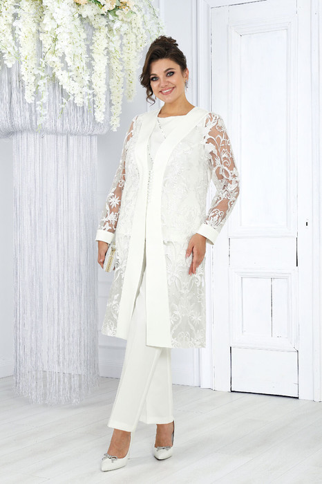 Комплект брючный 3-х предметный, состоящий из кардигана, блузки и брюк; выполнен из костюмно-плательной ткани и гипюра.