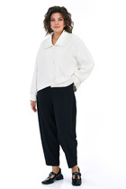 Блузка полуприлегающего силуэта, выполнена из хлопкового кружева. Модель без застежки, без плечевых накладок, с высокими (от талии) разрезами в боковых швах. С изнанки разрезы обработаны хлопковой тесьмой в цвет кружева, закрепленной с лицевой стороны отделочной строчкой шириной 3 см. Круглый вырез горловины переда и спинки обработан обтачкой из костюмно-плательной ткани в цвет кружева; ширина отделочной строчки по горловине 2 см. Рукав втачной, короткий. Низ блузки и низ рукава оформлен фестонами. Длина блузки – 76 см; длина рукава – 24 см.