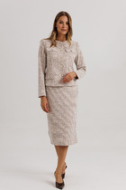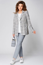 Комплект брючный 3-х предметный, состоящий из жакета, джемпера и брюк. Жакет прямого силуэта, выполнен из ткани «лен-вишер». Модель без подкладки, с плечевыми накладками и однобортной внешней застежкой с отрезными планками на 7 петель и 7 пуговиц. Перед с нагрудными вытачками, выходящими из пройм. По спинке и частично по переду настрочена кулиса, в которую втянут поясок из основной ткани. Для регулировки сборки по кулисе предусмотрены фиксаторы, концы пояса оформлены наконечниками. Горловина округлой формы со стояче-отложным воротником на отрезной стойке. Рукав втачной, длинный, с притачной манжетой, застегивающейся на 1 петлю и 1 пуговицу; по середине рукава настрочена пата, застегивающаяся на 1 петлю и 1 пуговицу, что позволяет регулировать длину рукава. Длина жакета - 71 см (46-50 р-р), 72 см (52-60 р-р), 73 см (62-66 р-р). Длина рукава (с манжетой) - 61 см. Джемпер полуприлегающего силуэта, выполнен из вискозного трикотажного полотна. Перед с нагрудными вытачками, выходящими из пройм. От горловины вниз застрочены 4 складки. Горловина переда и спинки округлой формы, по переду углубленная. Срезы горловин окантованы косой бейкой. Рукав втачной, короткий. Длина джемпера -60 см (46-50 р-р), 65 см (52-60 р-р), 67 см (62-66 р-р). Длина рукава – 24,5 см (46-50 р-р), 25,5 см (52-60 р-р), 26,5 (62-66 р-р). Брюки классические длинные, прямого силуэта, с посадкой на талии, выполнены из ткани «лен-вишер». Модель без застёжки, на притачном поясе, с эластичной лентой внутри. Передние половинки брюк с боковыми наклонными карманами. Длина брюк по боковому (с поясом)-103 см (46-54 р-р), 104,5 см (56-60 р-р), 106 см (62-66 р-р).