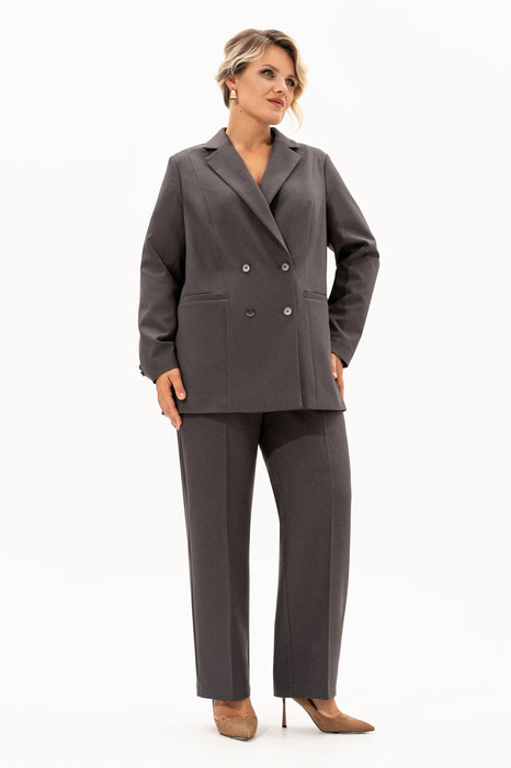 Элегантный женский костюм, в котором классика встречается с современными акцентами. Жакет выполнен в двубортном исполнении с выразительным пиджачным воротником, подчеркивающим строгость и стиль. Рельефы на полочках от плечевого шва придают силуэту структурность, а прорезные карманы в листочку добавляют практичности и утонченности. Особое внимание привлекает спинка: асимметричный рельеф на правой части, переходящий в шлицу, оформленную декоративными пуговицами — неожиданный и эффектный штрих. Втачные двухшовные рукава завершены аккуратными шлицами с тремя пуговицами, что добавляет костюму благородства и внимания к деталям. Брюки — лаконичные, с функциональными карманами и гульфиком на молнии. Удобный пояс с эластичной тесьмой по бокам делает посадку комфортной, не нарушая внешней строгости образа. Этот костюм — идеальное сочетание женственности, силы и комфорта. Он подойдет как для деловой встречи, так и  для повседневного выхода, где важна уверенность и стиль.