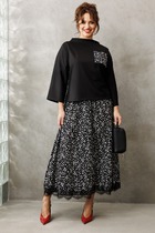 Невероятно нарядный классический женский комплект - двойка ALGRANDA: жакет и платье - это стильное и  комфортное решение для женщин больших размеров, которые ценят комфорт и стиль. Жакет пошит из костюмной жаккардовой  ткани на подкладке , в состав которой входит вискоза  и нейлон,  это обеспечивает человеку свободу движения. Жакет короткий, полуприлегающего силуэта на подкладке. Спинка со средним швом. По переду жакета есть рельефные швы от плеча. Застёжка на петли и пуговицы. Рукав втачной , длинный, двухшовный. Горловина круглая, смотрится очень актуально и эффектно в сочетании с накладными карманами, которые украшены  крупным жемчугом. В комплекте  к жакету идёт шифоновое платье на трикотажной подкладке.  Горловина платья овальной формы, нагрудные выточки направлены от бокового шва к центру груди, спинка со средним швом и каплевидной застёжкой на пуговице. Рукав втачной, одношовный , низ собран на эластичную  тесьму. Это воздушное платье очень красиво смотрится в сочетании с жакетом. В этом комплекте вы будете выглядеть безупречно!Отличный вариант для офиса и вечернего гардероба, а также и просто для повседневного применения. Грация, изящество, утончённые  декоративные элементы делают этот комплект уникальным.