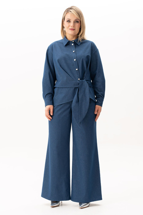 Предлагаем Вам легкий,  джинсовый костюм  — это стильный выбор для современной девушки или женщины. Джинсовый костюм двойка состоит из брюк  и блузы средней длины на пуговицах, что делает его универсальным выбором. Модель выполнена из легкого хлопка, что обеспечивает комфорт в течение всего дня. Подходит для различных сезонов — весной и летом он станет незаменимым элементом гардероба. Модель с джинсами выполнена в духе классики, но при этом остается актуальной и трендовой на все времена. Возможность носить элементы раздельно —  важное преимущество. Всесезонная блуза с длинными рукавами на манжетах легко впишется в Ваш повседневный, вечерний, а также деловой офисный стиль. Блуза с отрезной баской  и воротником, с застежкой на  пуговицы и завязку, что позволяет отрегулировать блузу по талии. Рукав длинный, втачной на манжете. По окату рукава обработаны складки. Стильная женская блуза класса люкс соответствует модным тенденциям 2025-26 года. Брюки с высокой посадкой прямого кроя . Мягкая эластичная резинка в поясе брюк обеспечивает комфортную посадку без стеснения движений, адаптируется к особенностям фигуры и не создаёт давления на талию, позволяя носить костюм целый день с лёгкостью. Джинсы с завышенной талией станут универсальным элементом гардероба как на каждый день, так и на праздничное мероприятие.  Если добавить парочку модных аксессуаров, то костюм легко трансформируется в наряд для вечеринки, дня рождения или другого значимого торжества. Не упустите возможность сделать заказ костюма прямо сейчас и приковывать к себе все взгляды  окружающих уже сегодня!
