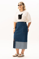 Предлагаем Вам комплект, состоящий из блузки и джинсовой юбки. Блузка из тонкой и легкой   ткани из  хлопока  с добавлением эластана,  идеально подойдет для жаркого летнего дня, так как отлично пропускает воздух. Эта блузка с печатью в виде собаки  станет отличным дополнением к вашему гардеробу, подчеркнет ваш индивидуальный стиль и добавит нотку стильной элегантности.  Джинсовая юбка-предмет одежды на все времена,это базовая вещь в гардеробе, которая отлично сочетается с разными стилями и подходит для любого возраста. Эта юбка — воплощение интеллектуального кэжуала. Выполнена из высококачественного джинса - очень приятна к телу. Главные особенности модели: двухцветный дизайн с контрастным светлым подолом, который визуально облегчает силуэт, притачной пояс со шлевками, функциональные накладные карманы и оригинальная застежка-гульфик, смещенная в сторону. Асимметричная планка с пуговицами и смещенная вправо застежка добавляют образу динамики и делают привычный деним ультрамодным.  Комплект уникален в том, что и блузку и юбку можно сочетать с другими элементами из Вашего гардероба. Благодаря разнообразию вариантов комбинирования, вы будете выглядеть модно и стильно в любой ситуации. Идеально для тех, кто ценит комфорт без потери стиля - выглядеть модно, но при этом быть свободными в движениях. Комплект  предназначен для создания разных силуэтов и позволяет экспериментировать с образами. Отлично подходит для работы, прогулок или вечернего выхода. Идеальный выбор для тех, кто ищет базу с характером.