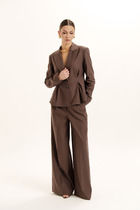 Жакет частично на подкладке с центрально-бортовой застежкой на две петли-пуговицы. Втачного покроя с двухшовным рукавом 3/4, с притачной манжетой. Жакет "оверсайз", прямого силуэта, с легким приталиванием. По переду жакета расположены прорезные карманы в рамку с клапанами, по низу – закругленные борта. Горловина оформлена воротником пиджачного типа.