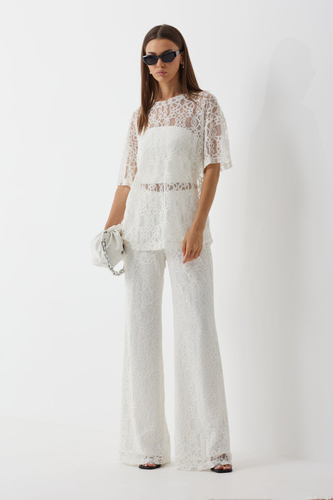 Комплект трехпрехпредметный, состоит из блузы, топа (бандо) и брюк. Выполнен из кружевного полотна.