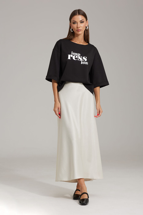 Юбка выполнена по косой, к низу расширена. Верхний срез на обтачке, по спинке – талиевые вытачки, в левом боковом шве – застежка на потайную тесьму-молнию.