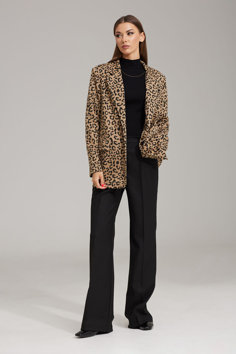 Жакет женский выполнен из трикотажного полотна дизайн леопард, на подкладке, втачного покроя, свободного силуэта - «оверсайз». Горловина оформлена воротником пиджачного типа. Застежка центрально-бортовая на петли- пуговицы. Рукав двушовный полной длины. На переде расположены рельефы вертикально направленные с нагрудной вытачкой, в области бедер прорезные карманы в рамку с клапаном, в верхней левой части переда расположена имитация кармана в рамку с клапаном фантазийной формы, что придает индивидуальность данному изделию. Клапаны и борта по низу слегка закруглены. Спинка состоит из бочка и центральных частей.