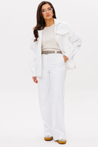 Жакет прямого силуэта с центрально-бортовой застежкой на петли - пуговицы. Спинка прямая. Воротник пиджачного типа. Рукав длинный, одношовный, втачной. По переду жакета расположены нагрудные вытачки, идущие из бокового шва. По низу переда – накладные карманы с клапаном (клапан выполнен по косой). В верхней части переда настрочен отделочный клапан (по косой). Застежка до верха, с отложным воротником. В комплект входит съемный пояс.