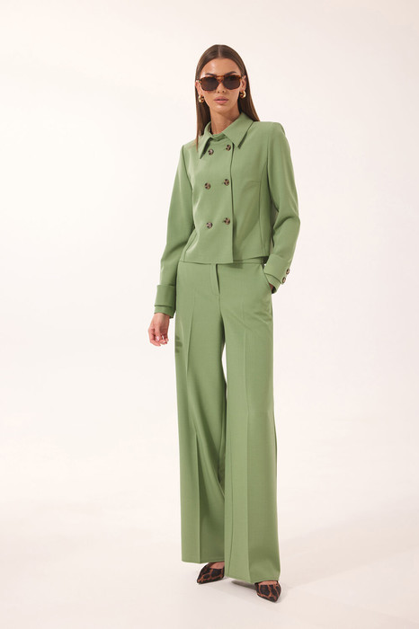 Жакет прямого силуэта, рукава двушовные с фантазийной патой на две пуговицы по низу. Горловина обработана воротником стояче-отложным с отрезной стойкой. По переду расположены нагрудные вытачки, идущие из шва притачивания боковой части. На спинке расположена встречная складка.